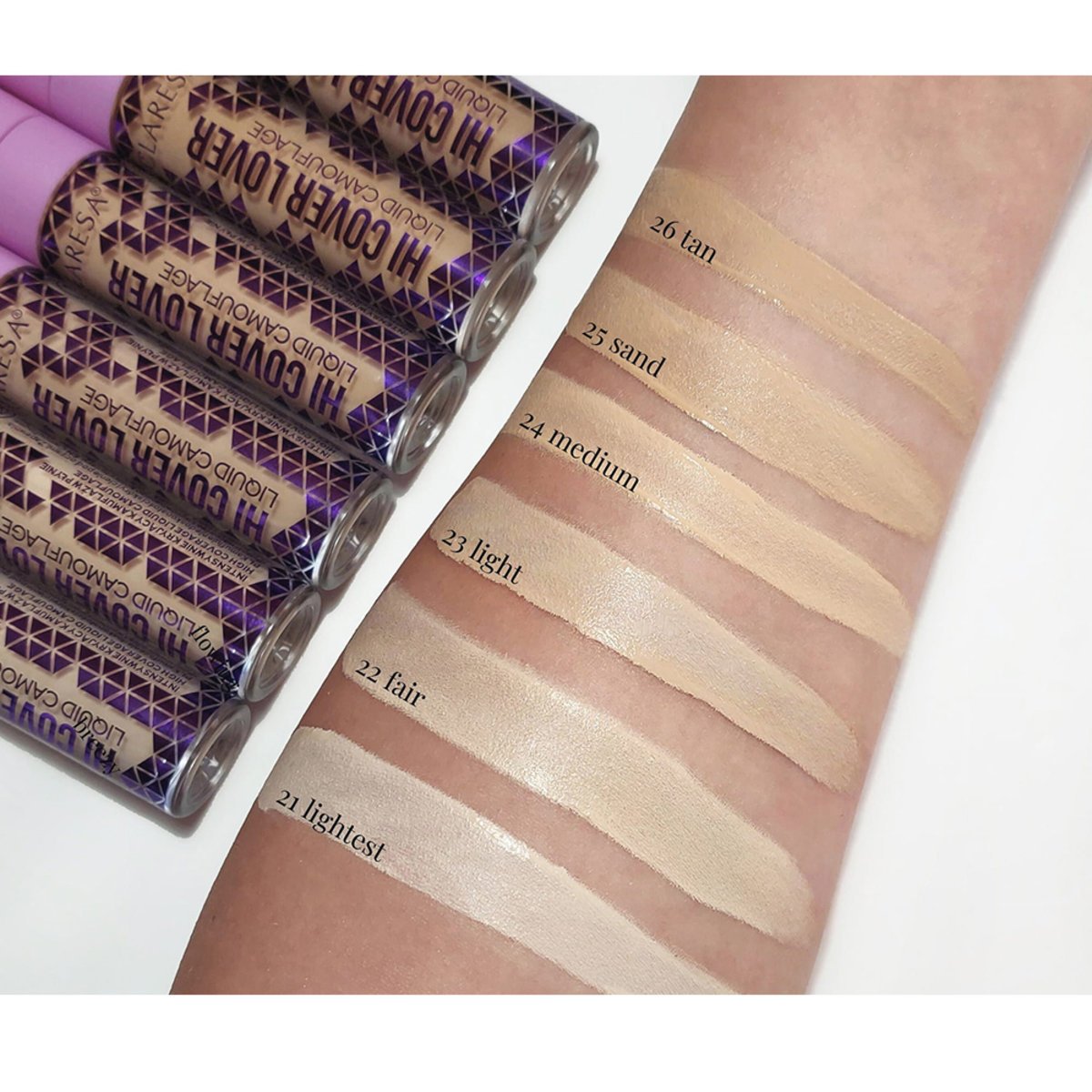 Інтенсивно пігментований рідкий консилер забезпечує оптимальне покриття, ідеально маскує недоліки під очима (темні кола) і на обличчі (знебарвлення, небажані веснянки, почервоніння). Консистенція HI COVER LOVER рівномірно розподіляється та ідеально зливається зі шкірою, не обтяжуючи її. Зручний великий гігантський аплікатор розподіляє потрібну кількість продукту та полегшує його нанесення на шкіру. Стійка водонепроникна формула фіксації забезпечує бездоганний макіяж протягом багатьох годин за будь-яких умов. Він доступний у 6 ретельно відібраних кольорах - від версій для білої кольору до більш бронзового кольору шкіри.