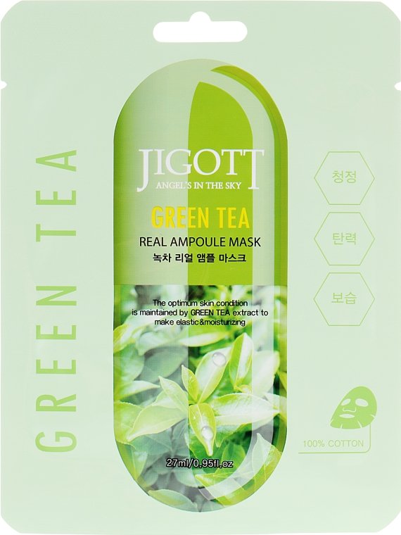 Маска тканинна для обличчя JIGOTT Grеen Tea Real Ampoule з екстрактом зеленого чаю подарує не тільки інтенсивне зволоження та антиоксидантний ефект вашій шкірі, але й хвилини насолоди приємним ароматом та відчуттям «оживлення» поверхні вашого обличчя. В основі цієї ампульної маски есенція , створена на основі екстракту зеленого чаю Цей компонент – визнаний у всьому світі потужний антиоксидант, що глибоко зволожує та повертає епідермісу властивості здорової шкіри.