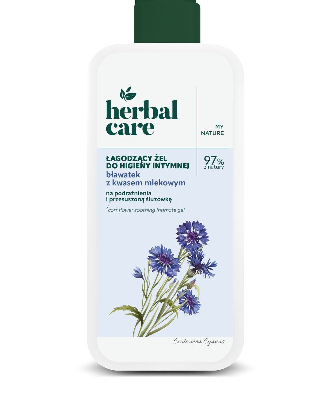 Herbal Care гель для інтимної гігієни «Волошка» 330 мл — делікатний засіб щоденного догляду за інтимною зоною, особливо для шкіри, схильної до подразнень. Формула містить екстракт волошки, масло чайного дерева, молочну кислоту та алантоїн. Волошка має регенеруючу і протизапальну дію, масло чайного дерева допомагає зменшити свербіж і почервоніння, а молочна кислота підтримує природний pH-баланс інтимної зони.